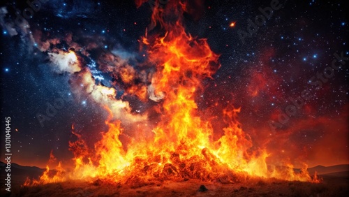 Fiery flames erupt in vibrant orange and red hues against a dark canvas of night sky with stars twinkling faintly , vibrant