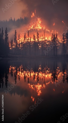 forest fire, flames, smoke, tree, lake, water, night, dusk, orange, red, dark, intense, burning, heat, wildfire, nature, landscape, scenic, dramatic, inferno, glow, silhouette, ominous, mysterious, peaceful, serene, contrast, danger, beauty