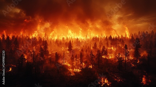 fire, inferno, wildfire, forest, flames, tree, burning, smoke, conflagration, blaze, heat, destruction, devastation, danger, emergency, disaster, crisis, nature, environment, timberland, wilderness, coniferous, pine, spruce, fir, cedar, tall trees, landscape, night, dark, orange, red, intense, hot, consuming, spreading, raging, uncontrollable, hazard, risk, damage, loss, ecological, impact, global, warming, climate