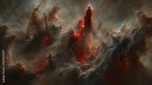 space, nebula, cosmic, stellar, dust, gas, cloud, light, dark, colours, orange, red, grey, formation, structure, bright, glowing, aethereal, atmospheric, dramatic, fiery, mysterious, abstract, detailed, texture, distant, universe, galactic, infinite, huge, cosmos, celestial, artwork, fantasy, imagination, exploration, visualisation, landscape, vista, depth, background, composition, illustration, design, pattern, art, imagery, beautiful
