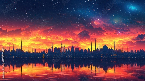 Fiery sunset cityscape reflection, starry night sky, fantasy art, travel poster