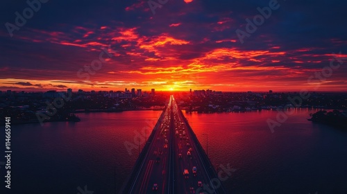 sunset, highway, bridge, city landscape, urban, traffic, red, sky, cloud, dramatic, evening, twilight, night, city, building, water, river, landscape, photo, aerial, view, panorama, beautiful, amazing, spectacular, vibrant, colours, nature, scene, background, travel, road, transportation, vehicle, car, light, dark, mood, atmosphere, golden hour, horizon, silhouette