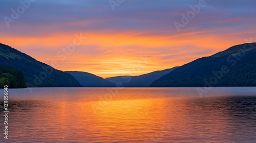 Fiery sunset over tranquil mountain lake, reflecting vibrant colors, serene landscape, ideal for travel brochures