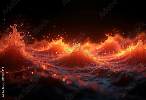 fire, wave, water, ocean, sea, lava, magma, heat, hot, fiery, glowing, ember, dark, surreal, seascape, abstract, texture, background, digital artwork, illustration, fantasy, nature, dramatic, intense, energy, power, light, spark, splash, ripple, molten, liquid, orange, red, black