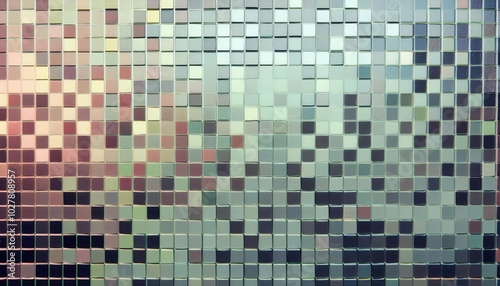 ニュートラルなトーンと繊細な色合いで構成された小さな四角形のモザイクで、ピクセル化された効果を生み出しています。色の不規則な配置によって、光と影の効果が深みと動きを感じさせるデザインです。
