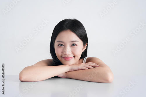 people, portrait, woman, girl, young, asian, japanese, korean, southeast asia, light, white background, light, cosmetic, care, beauty, make-up, make-up, cosmetic, skincare, skin, sunblock, este, hair care, black hair, toilet water, camisole, natural, sweet, pretty, face, expression, model, smile, smile, happy, fun