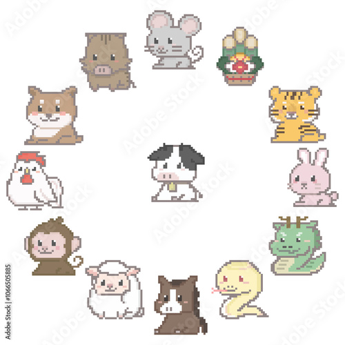 animal, icon, illustration, sweet, pretty, design, new year, animal, avatar, event, retro, culture, nostalgia, vacation, illustration, season, graphic, set, mouse, cow, tiger, rabbit, dragon, dragon, snake, horse, sheep, monkey, chicken, dog, boar, kadomatsu