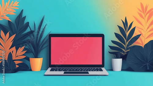 ノートパソコンと観葉植物が並ぶ鮮やかな背景のフラットデザイン