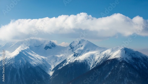 산봉우리 위로 하얀 눈과 함께 흐릿하게 드리운 구름