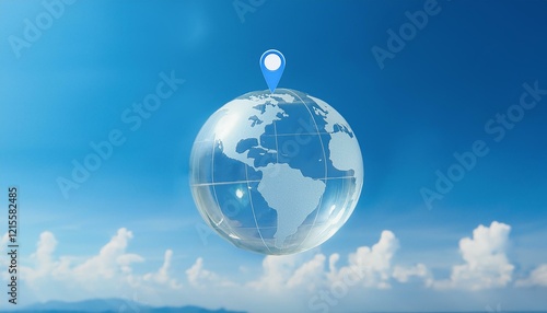 밝은 하늘을 배경으로 떠 있는 반투명 지구본에, 하나의 위치만 파란 핀으로 표시된 장면