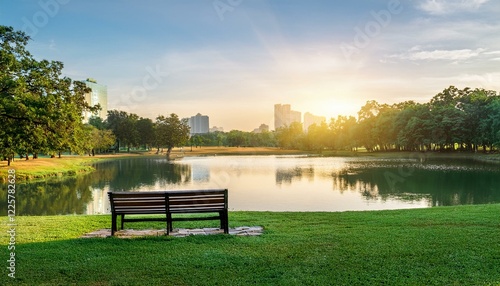 호수 옆 벤치와 잔디밭이 조화를 이루는 도시 공원 풍경