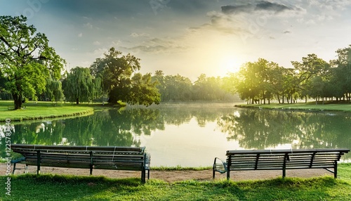 호수 옆 벤치와 잔디밭이 조화를 이루는 도시 공원 풍경