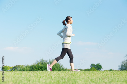 woman, running, jog, marathon, outside, park, open air, run, grass, lawn, blue skies, japanese, diet, health, training, exercise, exercise, sport, hoodie, young, sky, sunny, asian, copy space, blank space, space