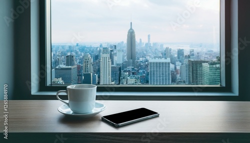 창가에 위치한 사무실 책상을 위에서 내려다본 장면, 탁자 위에는 커피잔과 스마트폰, 창밖으로는 도시의 고층 빌딩이 보인다