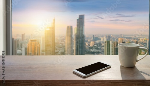 창가에 위치한 사무실 책상을 위에서 내려다본 장면, 탁자 위에는 커피잔과 스마트폰, 창밖으로는 도시의 고층 빌딩이 보인다