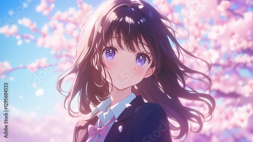 桜の木の下で髪をなびかせているアニメ調の日本人美少女