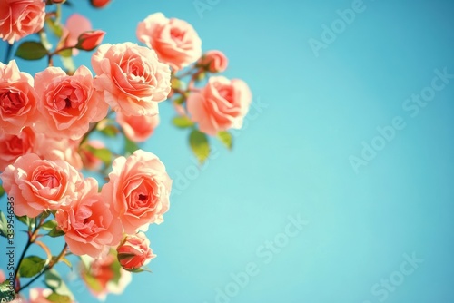 青空の下に咲く鮮やかなピンクのバラの花束