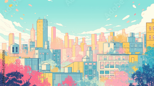 鮮やかな色彩で描かれた現代都市の街並みとカラフルな木々が織りなす景観イラスト 都会 高層ビル 住宅 街の風景 パステル色 ビジュアル素材 建物 自然 抽象アート