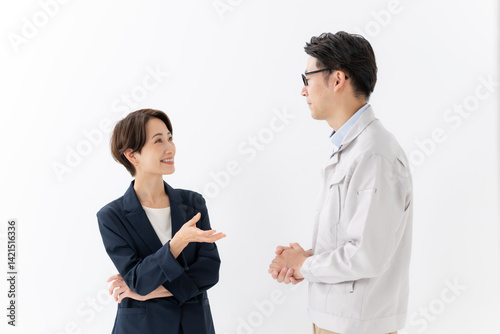 asian, japanese, woman, business, 30s, suit, man, short hair, boss, smile, businessman, proposal, engineer, industry, white background, work, work, career woman, corporate, showroom, architecture, construction, design, parley, advantage, share, counseling, sir, conversation, salesman, chat, consultation, finance, people, financing