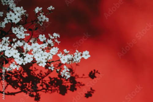 春の日差しの中で、赤い背景に白い花が鮮やかに咲いている。
