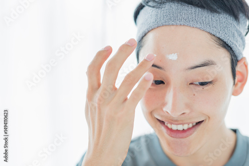 man, skincare, people, japanese, asian, student, cosmetic, skin, cleanliness, health, hairband, mirror, morning, lifestyle, natural, relax, positive, refreshing, grey, towel, clean, home, bathroom, bathroom, toilet water, sunblock, latex, beauty