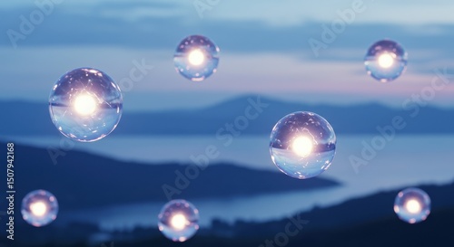 sphere, light, landscape, sky, background, abstraction, future, fantasy, science, technology, ball, light, brilliancy, shimmer, sparkling, artistic, design, dream, calm, quiet, morning, dusk, nature, mountain, sea, view, blue, purple, gradation, lovely, contemplation, relax, digital, art, three-dimensional