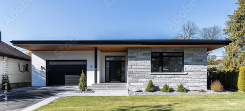 シンプルな日本の平屋住宅、戸建て住宅 グレー 石壁