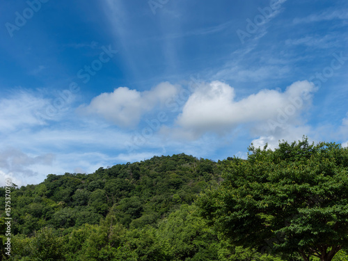 summer, blue skies, mountain, verdure, green, plant, leaf, wood, sunny, midsummer, background, unmanned, japan, morning, morning, landscape, sky, cloud, nature, open air, forest