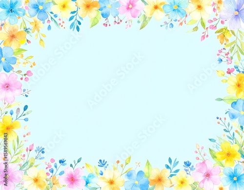 flower, colourful, pastel colour, sky blue, background, frame, watercolor, illustration, copy space, floral, spring, summer, surround, flowering, nature, bloom, beauty, season, plant, lovely