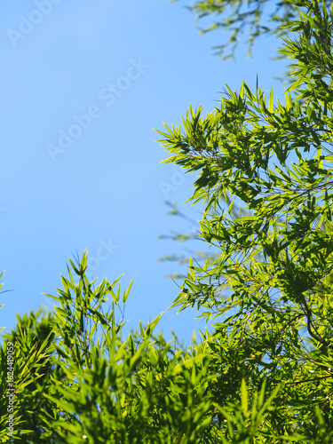 sky, leaf, blue skies, sunny, light, nature, vivid, green, green, branch, foliage, branch, bamboo, summer, natural, wind, vertical