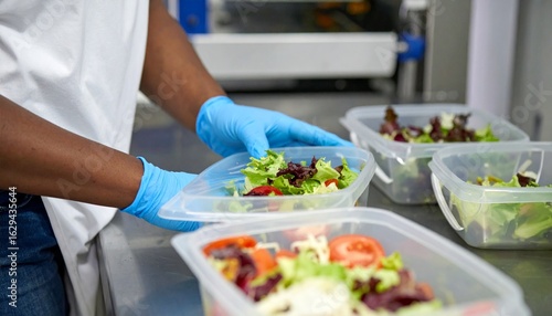 salad, container, film, wrap, glove, working man, mechanism, industry, factory, food, health, production, processing, site, working, management, foodstuff, ingredient, feeding, inspection, flow, mounting, equipment, operation, quality, packing, clean, logistic, foreground, label, product, preparation, production, hand, control, custody, transport, speed, surveillance, rig, safe, cleaning, director