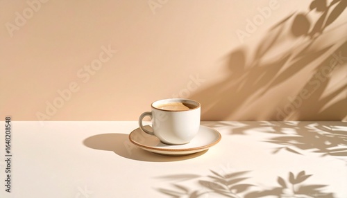 マットなアイボリーの背景にシングルカップを置いたミニマル構図です。 深い影と落ち着いた色合いが、シンプルで洗練された雰囲気を演出します。