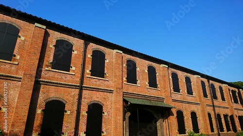 warehouse, brick, red, building, museum, museum, blue skies, wood, green, landscape, kanazawa, kenrokuen, travel, tour tourism, spot