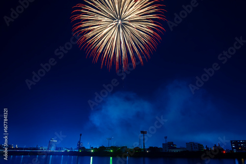 fireworks, night, nightscape, building, town, building, sky, smoke, light, fire, explosion, colourful, entertainment, entertainment, japan, city, summer, event, tour tourism, leisure, custom, blue, black, event, landscape, august