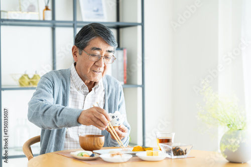 meal, aged, man, aged, meal, food, japanese, people, rice, breakfast, smile, second life, lifestyle, appetence, lively, white rice, miso soup, house, table, waist up, face, casual, light, refreshing, table, health, grandfather, dish, seated, home, copy space, portrait, eating, smiling, person, indoor, good-looking