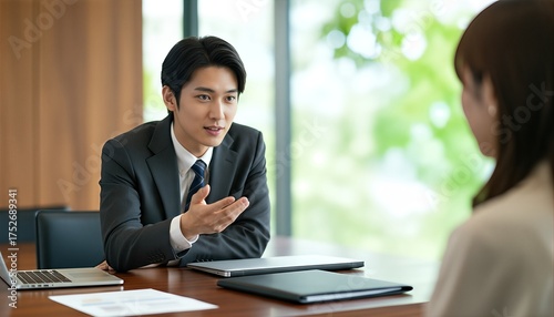 man, two people, japanese, asian, businessman, meeting, version, personal computer, speaking, woman, meeting, counseling, waist up, office, suit, table, document, indoor, seated