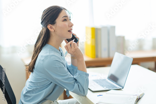 people, japanese, asian, woman, young, lifestyle, smile, business, work, office, corporation, office, sweet, pretty, copy space, light, lovely, beauty, relax, indoor, indoor, room, portrait, waist up, seated, chair, waist, personal computer, desktop, monitor, profile, watch, smartphone, smartphone, mobile phone, call, speaking, pen, woman, notebook, call, computer, businesswoman, chat, smile