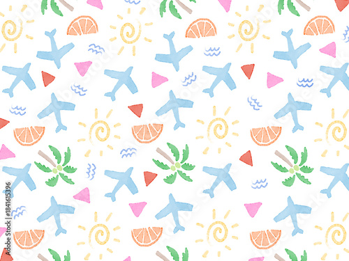 白背景に手描きイラストパターン。夏の旅行やビーチ・リゾートのコンセプト。水彩の飛行機とヤシの木