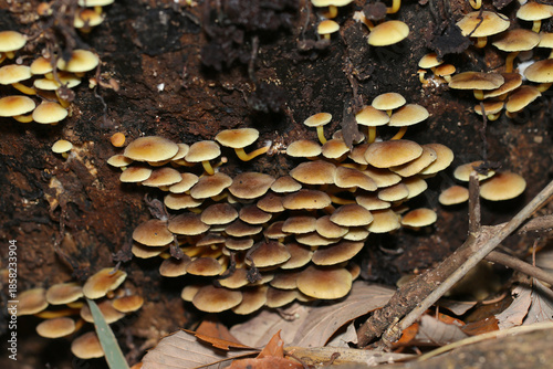 暗い森の腐食土壌に誤食しやすい毒キノコのニガクリタケが群生(自然環境下菌・キノコ類マクロ撮影)