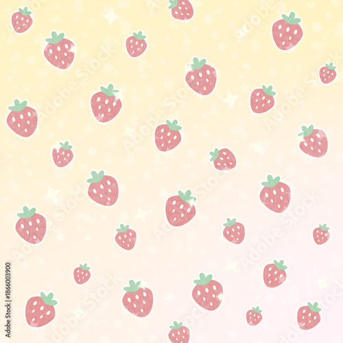 ゆめかわストロベリーのパステルグラデーション_デザインペーパー(イエロー)ー イエロー〜ピンクのグラデーションに、ハートと星がきらめくいちごモチーフ。デザインペーパー、シール帳の表紙、マスキングシールブックタイプ、フレークシール, ノートの表紙、ハンカチ、ミニタオルに最適。推し活グッズにも。