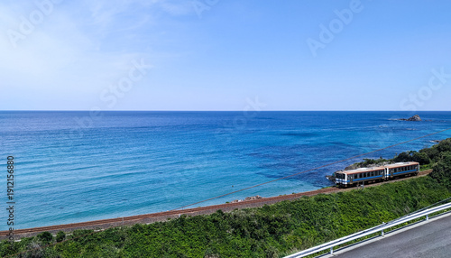 広大な青い海と画面右側を走るローカル線の列車(左側にコピースペース・背景素材)