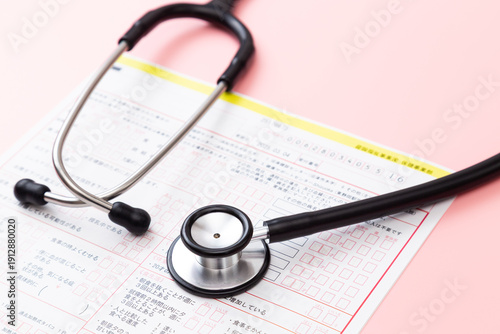 ピンク背景に問診票と聴診器