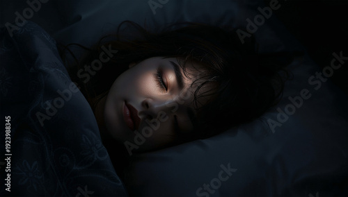 japanese, woman, sleep, bed, bedchamber, night, pillow, blanket, shade, lighting, stand, peace, dream, rest, health, indoor, sleep, texture, eyelash, skin, hair, cleanliness, tenderness, photo, people, bedding, light, shadow, tone