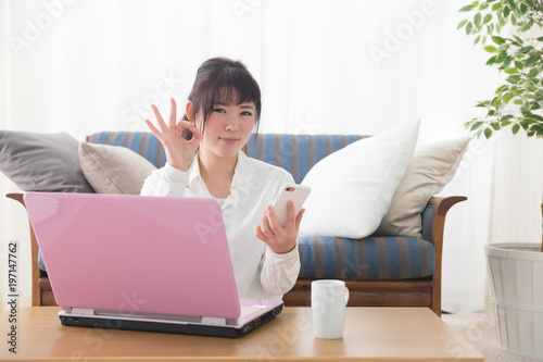 woman, people, youth, young, japanese, alone, pretty, face, couch, couch, home, casual, lifestyle, life, relax, houseplant, window, asian, refreshing, light, indoor, indoor, room, personal computer, notebook, personal computer, cyberspace, reservation, smartphone, smartphone, mobile phone, call, search, relax, light, daytime, seated, ok, good, success, joyful