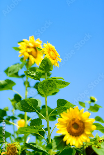 sunflower, summer, nature, landscape, view, plant, flower, up, blue skies, sunny, cloud, flower petals, full bloom, light, cut diamond, colourful, yellow, green, variegated, closeup, pretty, lovely, vivid, refreshing, health, lively, activity, gaiety, fun, happy, happiness, grow, pretty, calm, naivete, soft, sun, background, copy space