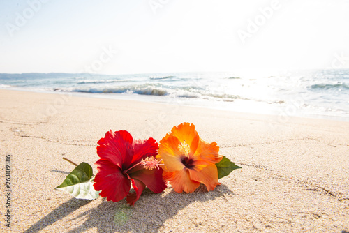 砂浜とハイビスカス