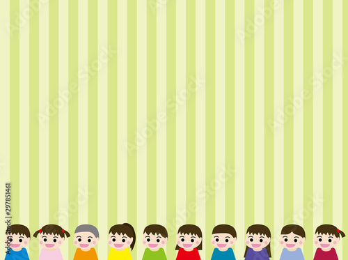 frame, children, illustration, sweet, colourful, japanese, children, boy, girl, girl, edging, frame, ponytail, bonze, crop, long hair, red, blue, orange, green, purple