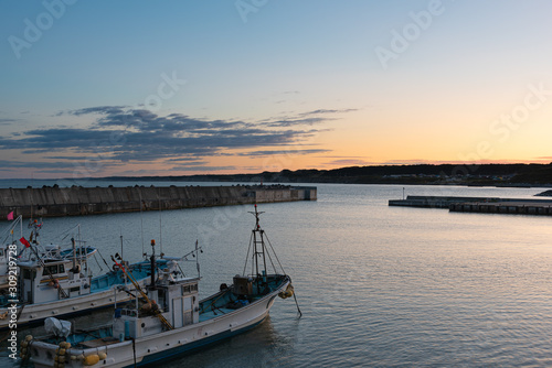 夜明けの穏やかな漁港の風景 / 北海道初山別村