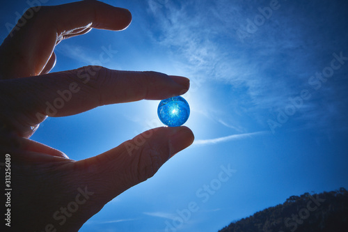 ビー玉を持つ手。青い空。