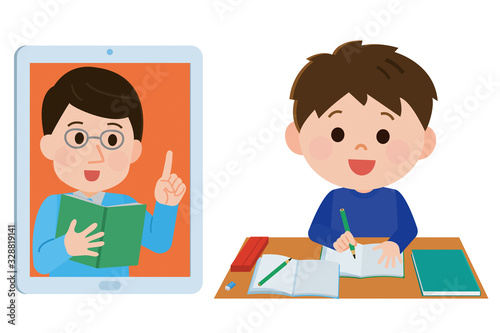 online, learning, boy, cyberspace, school, delivery, study, teacher, school, distance learning, tablet, teacher, lecturer, school, tutor, e-learning, app, digital, cloud, man, table, noto, stationery, vector, illustration, training, waist up, smile, fun, net, image